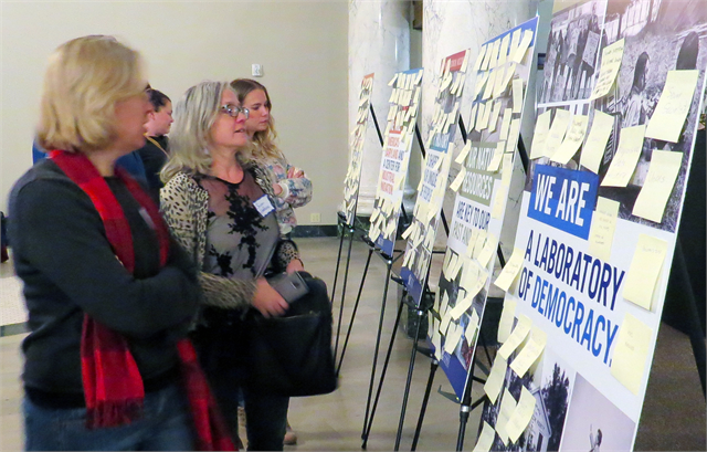 Guests look over boards filled with new museum suggestions from fellow attendees Oct. 24 at the Society's statewide engagement session at the Milwaukee County Historical Center in Milwaukee.