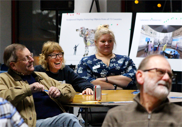 As at other engagement sessions, the rendering receiving the most mixed reaction was one of a giant cow sculpture featuring items from all 72 counties. It attracted most of the red stickers from the group.