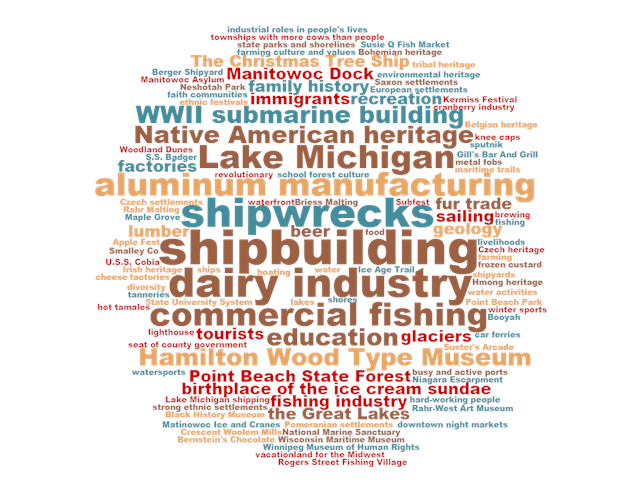 Attendees used Post-It notes to share ideas about what people across the state should know about their area and its history. Those notes were placed on theme boards in the front of the room and were saved by Society staff to inform future museum planning as well as for creating word clouds to highlight most-suggested terms at each location and overall. (See Manitowoc’s word cloud below.)