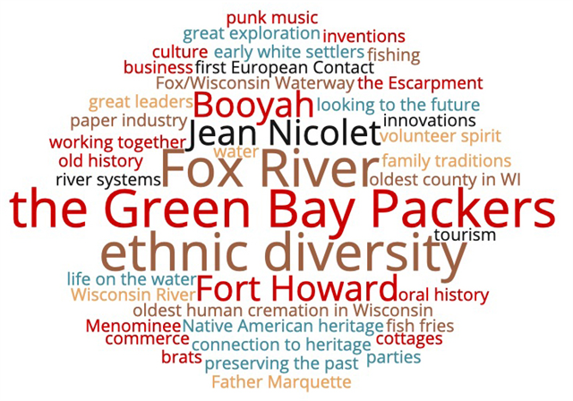 Among the words and phrases they shared: “The Green Bay area was first populated by the Menomonee Indians,” “early commerce on the Fox River,” “Punk music hotbed of the ’70s,” “the amazing Native American heritage, past & present,” “the great exploration 400 years ago of Jean Nicolet,” “Booyah” and “our region is the oldest county in Wisconsin.”