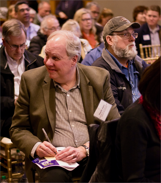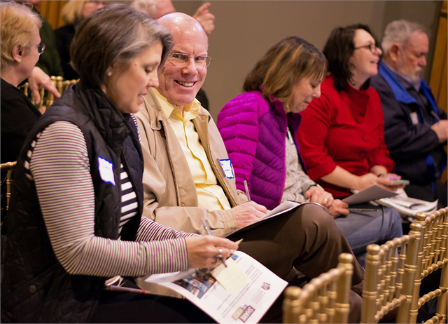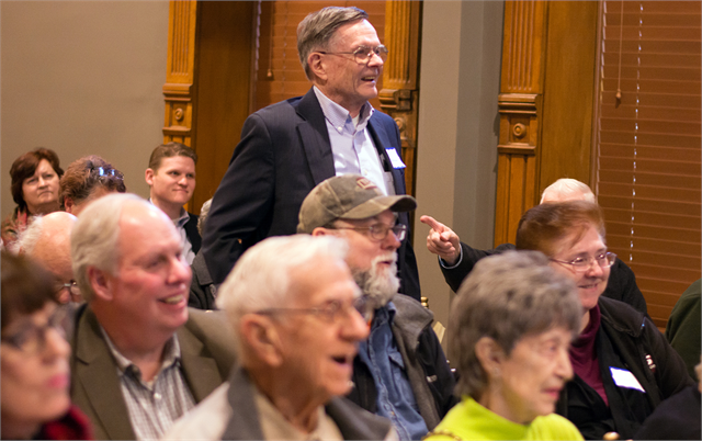 Charlie Byler, a Waukesha County Historical Society & Museum board member, enjoys a laugh with fellow guests at the Wisconsin Historical Society’s March 13, 2019 “Share Your Voice” new museum public listening session in Waukesha.