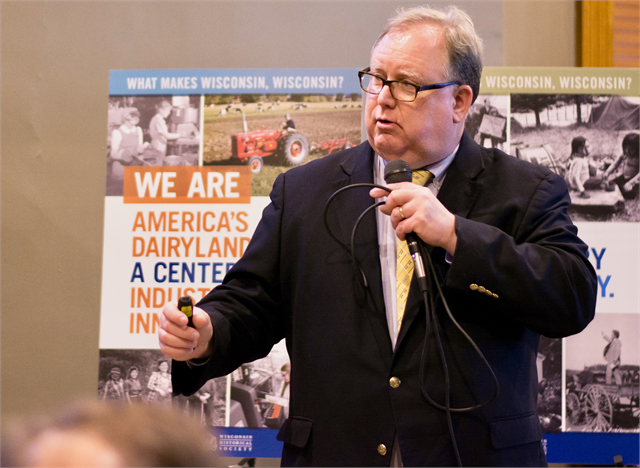 Øverland then played a video that described the overall focus of the new museum — “What Makes Wisconsin, Wisconsin?” — as well as several underlying themes.