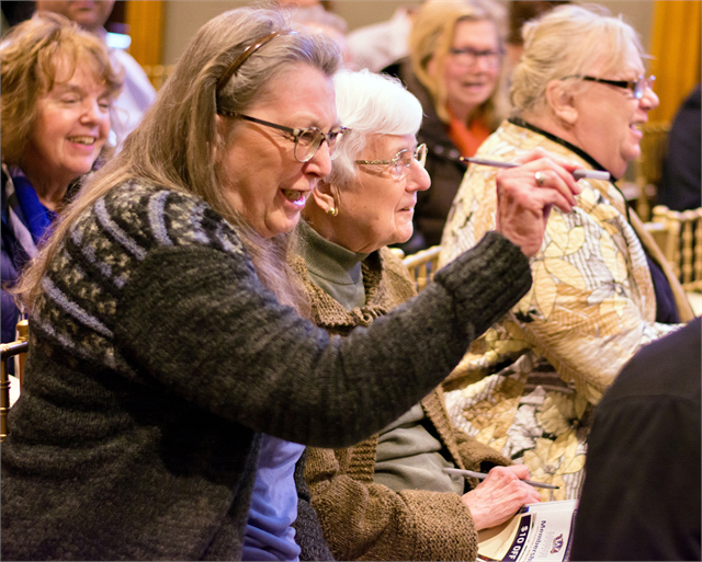 A guest chuckles with guests as she makes a point during the Society’s “Share Your Voice” new museum public listening session March 13, 2019 in Waukesha.