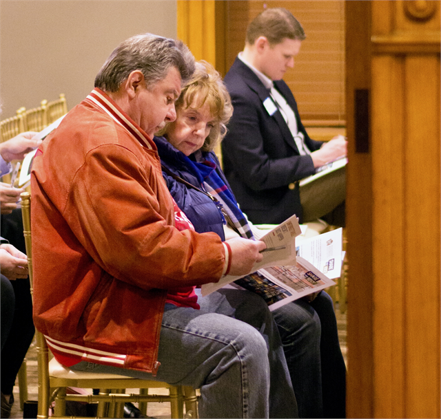 Guests look over materials describing the Wisconsin Historical Society’s new museum project prior to the “Share Your Voice” public listening session March 13, 2019 in Waukesha.