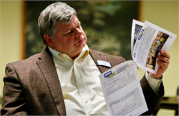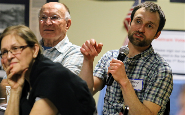Andrew Maule of Madison, seated with his parents George and Sandra of Georgia, shares his thoughts about a rendering of a concept exhibit design for a new Wisconsin history museum during the Wisconsin Historical Society’s “Share Your Voice” listening session June 12, 2019 in Wausau.
