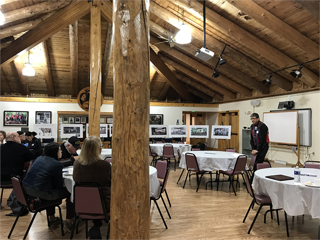 Society staff greeted community members as they arrived and chatted over a meal before the formal start of the program. Society staff members in attendance included Christian Øverland, the Ruth and Hartley Barker Director, Jennifer Kolb, Division of Museums and Historic Sites Administrator, Rebecca Comfort, American Indian Nation Liaison, and Janet Seymour, Field Services Representative.