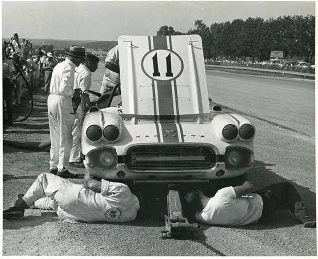 Don Yenko’s Chevrolet Corvette gets super service in the pits during the Road America 300 Mile production car race during the 1961 June Sprints.
