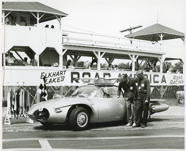 Road America President Clif Tufte and General Motors VP Harvey Earl talk to the driver of the Firebird II concept car at Road America in 1956.