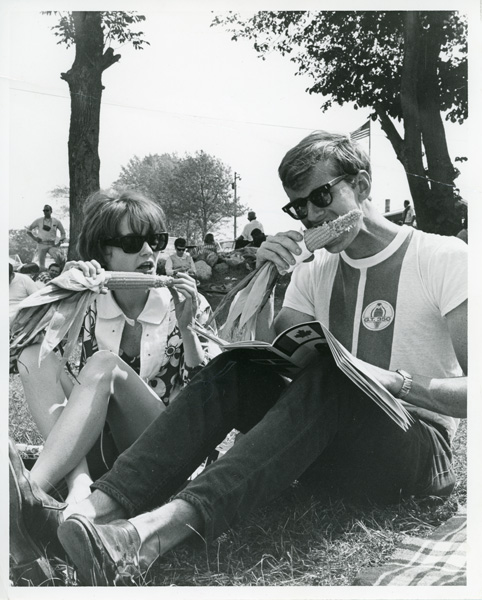 A couple enjoys corn on the cob while watching Road America’s 1967 Can-Am race. Courtesy of Road America Archives.