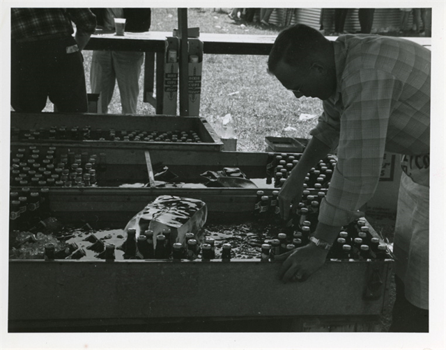 A volunteer grabs an ice-cold beer for a customer during a Road America race in 1960. Photo by Pierre Perrin. Courtesy of Road America Archives.